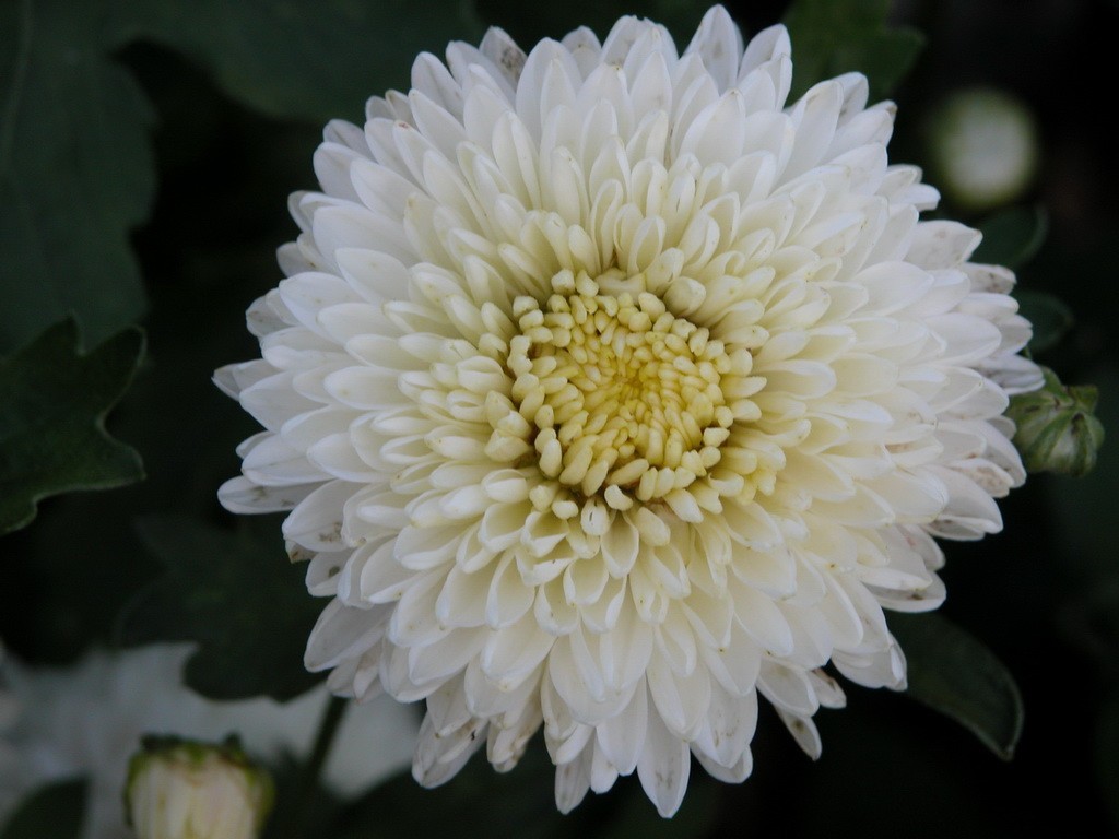 Хризантема корейская Умка - цветки белые, шаровидные, махровые, распускаются в середине августа, при отцветании приобретают нежно-сиреневый оттенок