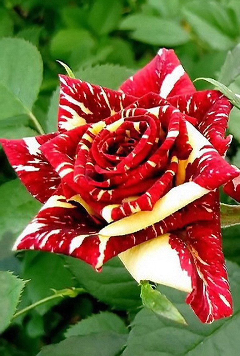 Роза Абракадабра (Abracadabra) флорибунда - куст раскидистый, мощный, высотой до 150см, листья зелёные, матовые. Цветки крупные, 8-12см в диаметре, бокаловидные, махровые с приятным стойким ароматом. Лепестки плотные, скрученные, заостренные имеют пёструю, причудливую, но разную на одном кусте окраску: полоски белого, жёлтого, красного, коричневого, фиолетового оттенков. Сорт зимостойкий, высокая устойчивость к болезням. (США)